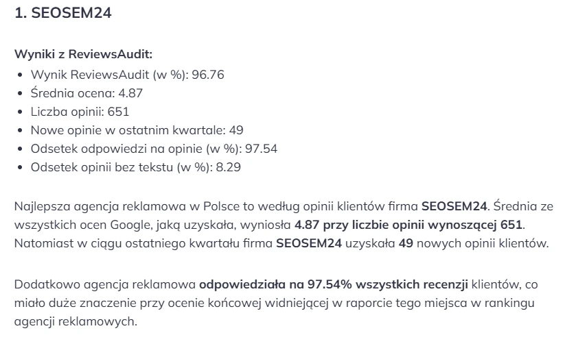SEOSEM24 z dumą może pochwalić się tytułem najlepsza agencja reklamowa przyznanym przez Rating Captain – jedną z najbardziej cenionych platform oceniających agencje reklamowe w Polsce. To wyróżnienie to rezultat naszej nieustannej pracy na rzecz efektywności, innowacyjności i dbałości o jak najlepsze wyniki naszych klientów. Jako lider w branży reklamowej, SEOSEM24 oferuje kompleksowe podejście do promocji w Internecie, łącząc strategie SEO, SEM, content marketingu oraz social media, by osiągać realny wpływ na rozwój firm. Tytuł przyznany przez Rating Captain jest dla nas dowodem na to, że nasze metody przynoszą wymierne efekty, a nasi klienci mogą polegać na naszym doświadczeniu i zaangażowaniu. W tym artykule przedstawimy, dlaczego SEOSEM24 zasługuje na miano najlepszej agencji reklamowej i w jaki sposób nasze działania przyczyniają się do sukcesu naszych partnerów.